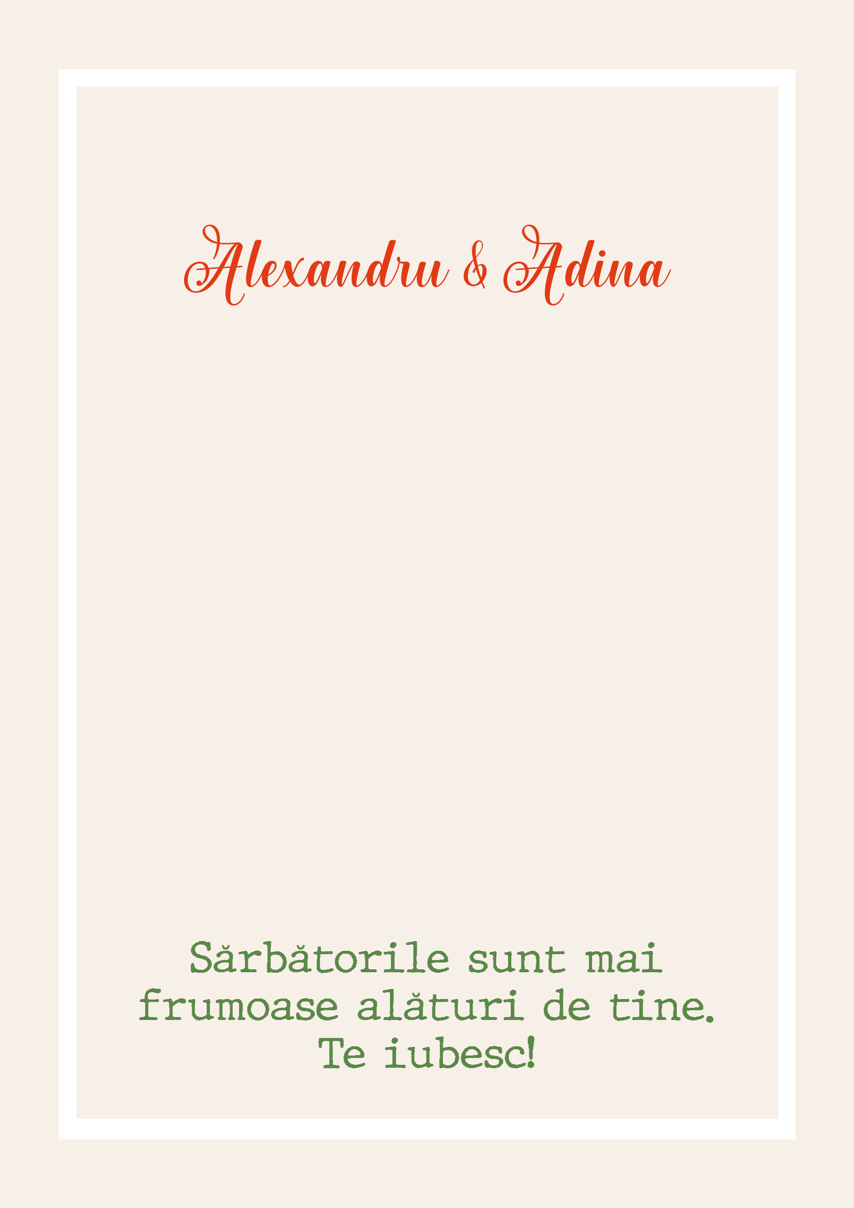 Transformă cele mai frumoase amintiri într-un cadou magic de Crăciun! Cardul nostru personalizat, cu poză și mesaj ales de tine, este modul perfect de a transmite iubire, recunoștință și bucurie celor dragi. Ideal pentru cupluri, prieteni sau familie. Ce pot personaliza? Cardul poate fi personalizat cu o poză și text.