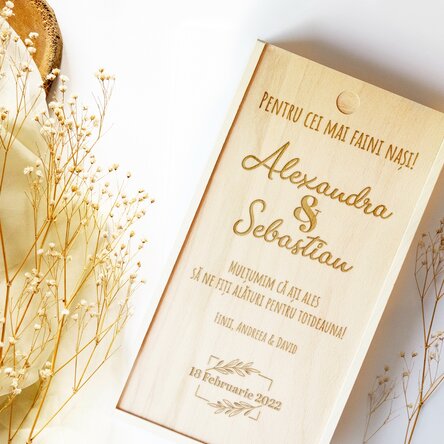 Vezi și alte Cadouri de nuntă și cununie, Cadouri pentru cerere de nași, Cadouri din lemn, Cutii de cadou din lemn, Cadouri gravate, Cadouri personalizate, Cele mai votate, Recomandările noastre, Cadouri pentru pasionații de vinuri, Cadouri pentru nașii de cununie, Toate cadourile pentru nuntă și cununie, Cadouri noi și originale, Cadouri de nuntă și cununie, Cadouri de apreciere, Cadouri pentru nași, Cutii din lemn gravate.