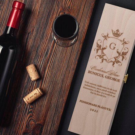 Informare: băuturile alcoolice se comercializează doar persoanelor peste 18 ani.Vezi și alte Cadouri din lemn, Cutii de vin personalizate pentru o sticlă, Cadouri gravate, Cadouri personalizate, Cutii de vin personalizate din lemn, Recomandările noastre, Cadouri pentru pasionații de vinuri, Adulți, Cutii de vin spumant, Cadouri pentru bunic, Toate cutiile de vin, Cutii de vin gravate, Cutii de vin pentru familie gravate, Cutii de vin de apreciere gravate, Cadouri noi și originale, Cadouri personalizate pentru 60 ani, Cadouri de pensionare, Cadouri personalizate pentru bunici, Cutii din lemn gravate.