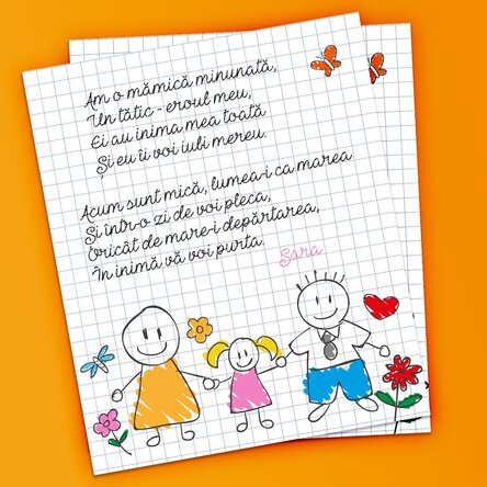 Copii au harul să le transmită părinților dragostea pe care au în cele mai simple și drăgălașe moduri. De multe ori se întâmplă ca cei mari să aibe multe de învățat din inocența lor. Dacă cea mică își dorește să scrie o poezie scrisă pentru dragi ei părinți, poți să personalizezi acest magnet cu cele mai năstrușnice și frumoase rime, iar ea va fi mandră că poezia ei are loc de cinste pe frigider.