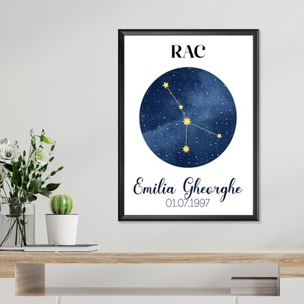 Descoperă farmecul cerului nopții cu acest poster personalizat dedicat zodiei Rac! Ilustrarea delicată a constelației Rac aduce un strop de magie astrală în orice încăpere, fiind în același timp un omagiu adus sensibilității, intuiției și grijii caracteristice nativilor acestei zodii.