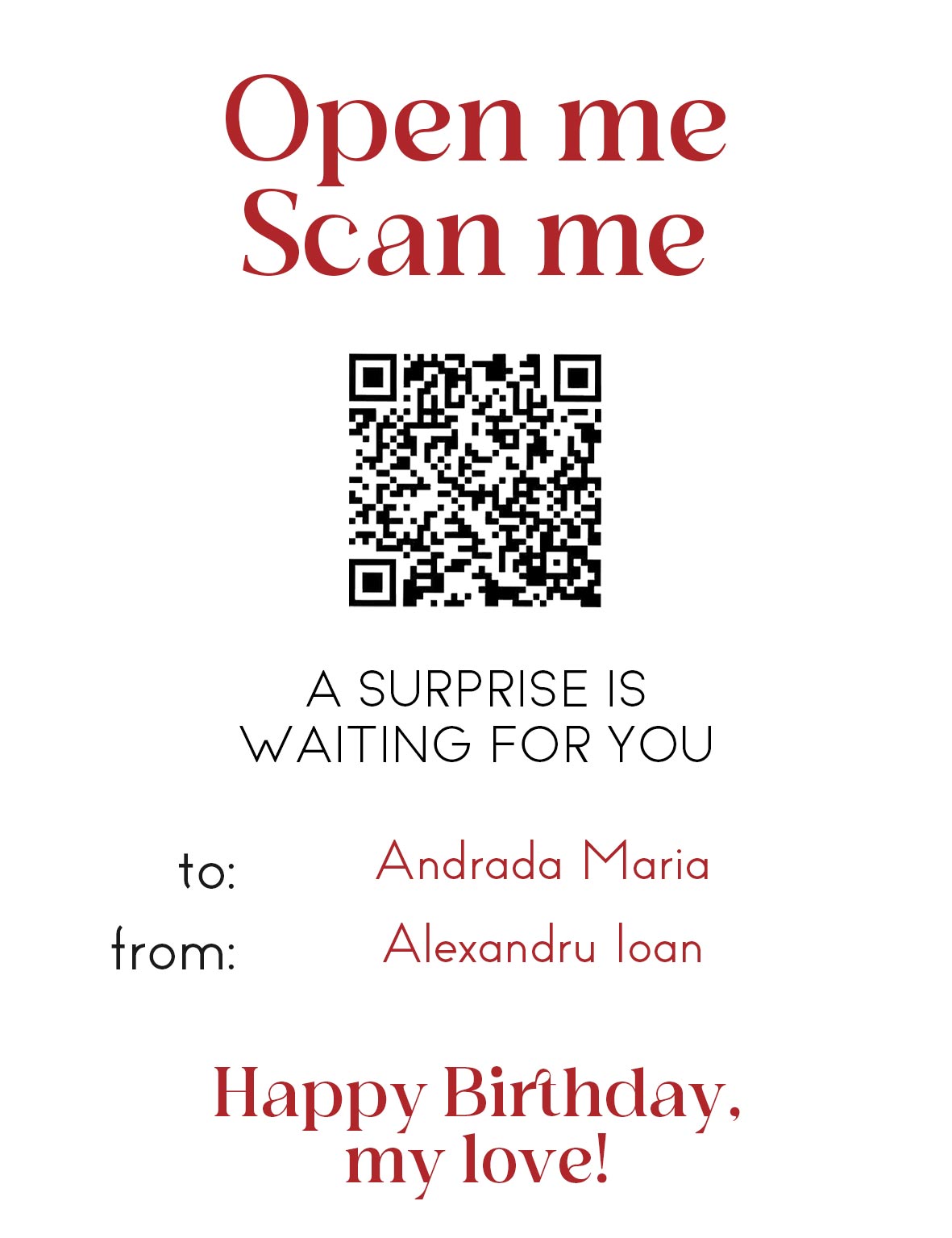 Pentru tine — pentru tot ce ești, pentru cât de mult însemni și pentru câtă bucurie aduci. Scanează codul QR și descoperă un mic cadou ascuns, pentru că meriți din plin să fii sărbătorit(ă) într-un mod special! Această sticlă de vin este personalizată cu text și cod QR pentru a ura un călduros la mulți ani celor mai importante persoane din viața ta!