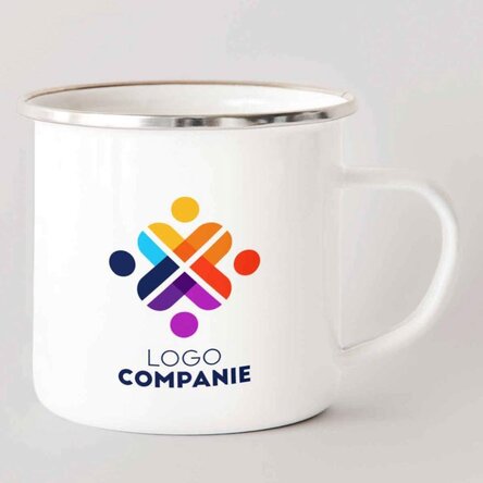 Model cană: Culoare albă, cu margine superioară cromată, personalizată prin imprimare