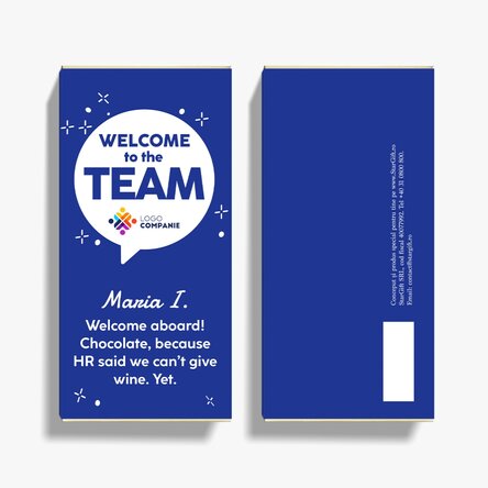 O surpriză dulce pentru noii colegi. Ciocolata personalizată cu logo-ul companiei și mesajul „Welcome to the team” este modul ideal de a-i face pe noii angajați să se simtă apreciați chiar din prima zi. Ambalajul personalizat cu identitatea vizuală a brandului tău și un mesaj prietenos, transformă acest gest simplu într-o experiență memorabilă.