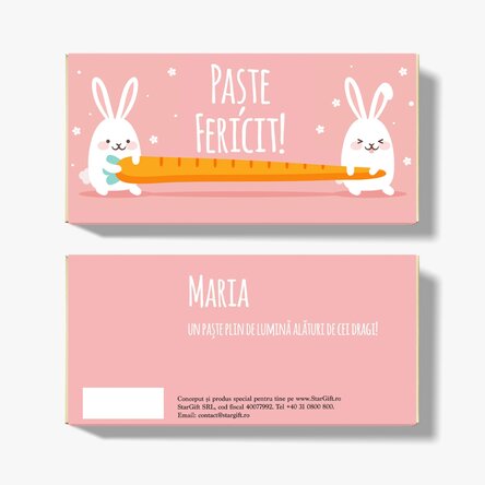 Dacă anul acesta de Paște vrei să fii iepurașul plin de cadouri pentru cei dragi ție, nu uita că este foarte ușor să îi mulțumești. Noi iți recomandăm o ciocolată personalizată, marca StarGift, prin care suntem siguri că nu vei da greș, indiferent cui îi vei oferi această ciocolată.