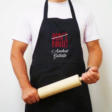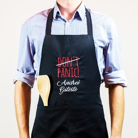 Starting with a simple message such as "Don't panic, Andrei is here" or "Don't panic, Andrei is ready", to funny messages such as "Don't panic, Andrei isn't burning anything today!" or "Don't panic, Andrei is lucky!". Other than that, don't panic! The apron will be delivered on time, so you can give it to the lucky person who loves smoke bombs in the kitchen.