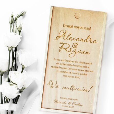See also other Cadouri de nuntă și cununie, Cadouri personalizate pentru el, Toate cadourile pentru ea, Toate cadourile pentru iubită, Cadouri din lemn, Cutii de cadou din lemn, Cadouri gravate, Cadouri personalizate, Cele mai votate, Recomandările noastre, Cadouri pentru pasionații de vinuri, Cadouri pentru nașii de cununie, Toate cadourile pentru nuntă și cununie, Cadouri noi și originale, Toate cadourile pentru iubită, Toate cadourile pentru el, Cadouri de nuntă și cununie, Cadouri de apreciere, Cadouri pentru nași, Cutii din lemn gravate.