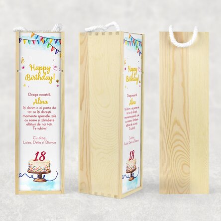 Notă: Vinul nu se poate alege. În funcție de stocul disponibil se trimite Budureasca sau Domeniile AvereștiSee also other Cadouri de zi de naștere, Cadouri de zi de naștere pentru ea, Cutii de vin personalizate pentru o sticlă, Cadouri personalizate, Cutii de vin personalizate din lemn, Cutii de vin personalizate cu poză, Recomandările noastre, Cadouri pentru pasionații de vinuri, Vinuri, Adulți, Toate cutiile de vin, New and original gifts, Cadouri personalizate pentru 18 ani, Cadouri pentru majorat, Toate cadourile de zi de naștere.