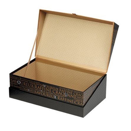 Designul său atent lucrat, completat de o imprimare elegantă, conferă un aspect rafinat care se potrivește oricărui tip de pachet gourmet – fie că vorbim despre selecții de dulciuri tradiționale, seturi de brânzeturi fine, condimente premium sau mixuri de produse locale. Textura plăcută la atingere și nuanțele armonioase ale imprimeului transformă cutia într-un veritabil element de prezentare, adăugând un plus de valoare oricărui cadou.