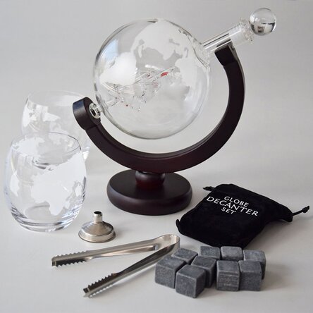 Pentru cei care știu să se răsfețe sau vor să dăruiască un cadou cu stil, avem pentru ei acest deosebit decantor pentru băuturi alese. Carafa emblematică a Globului Pământesc inspiră luxul datorită suportului de lemn și sticla gravată, cu cele 2 pahare Deluxe. Acestea sunt lucrate manual, iar piesa de arta este reprezentată de barca ce se află în interiorul globului având impresia că aceasta plutește atunci când recipientul are băutură. Acesta arată foarte bine, atât gol cât și plin și se potrivește perfect ca un obiect decorativ pe biroul oricărui iubitor de băuturi fine.