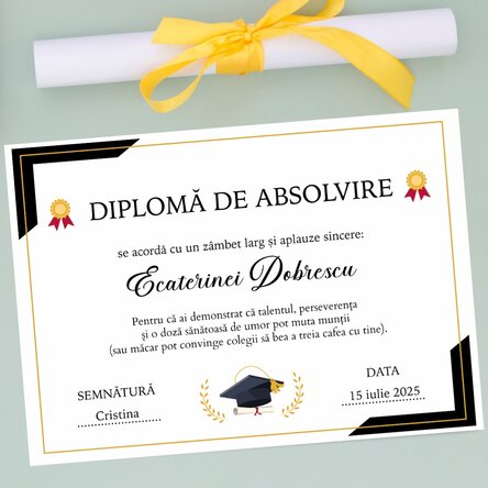 Cu un strop de umor și o notă de originalitate, această diplomă nu va fi doar o amintire, ci și o sursă de zâmbete. Poți personaliza diploma cu un mesaj amuzant care să reflecte personalitatea și stilul celui care a absolvit. Fie că este vorba de o glumă sau de o remarcă subtilă, acest cadou va aduce cu siguranță un zâmbet pe fața celui care îl primește. Nu lăsa momentul solemn al absolvirii să treacă neobservat. Oferă un cadou care să își păstreze farmecul și umorul în timp.