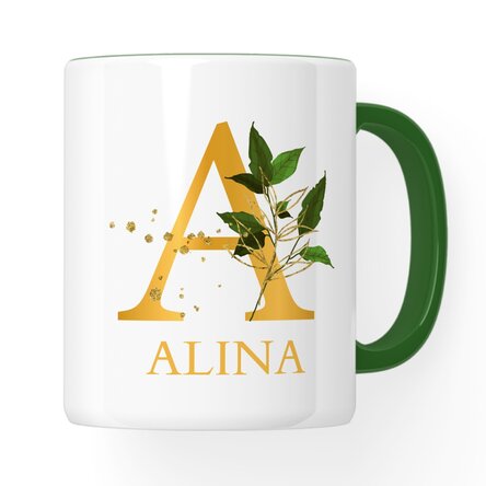 🌸 The mug with a handle and green interior, personalised with a name and decorated with a floral pattern, is ideal for coffee, tea or moments of relaxation.