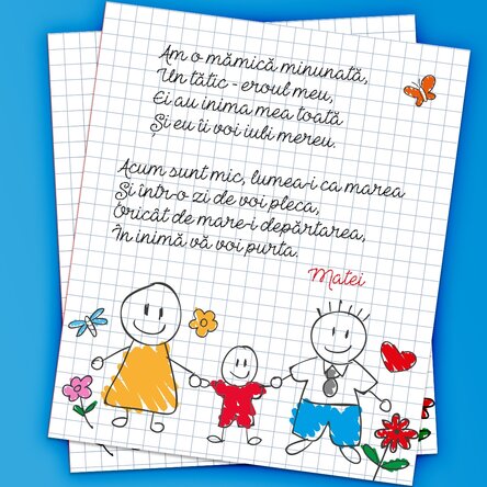 Copii au harul să le transmită părinților dragostea pe care au în cele mai simple și drăgălașe moduri. De multe ori se întâmplă ca cei mari să aibe multe de învățat din inocența lor. Dacă cel mic își dorește să scrie o poezie scrisă pentru dragi lui părinți, poți să personalizezi acest magnet cu cele mai năstrușnice și frumoase rime, iar el va fi mandru că poezia lui are loc de cinste pe frigider.