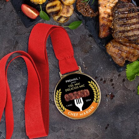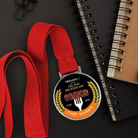Cu un mesaj amuzant și plin de farmec, această medalie este perfectă pentru pasionații de mici care domină grătarul ca niște adevărați profesioniști. Personalizează mesajul pentru a-l face și mai special, și fă-l să se simtă ca un adevărat rege aflat în fruntea măiestriei culinare. Realizată cu atenție la detalii, această medalie nu este doar un premiu obișnuit, ci o declarație de recunoaștere a talentului. Indiferent dacă e vorba de grătarul de weekend sau de o competiție "serioasă", această medalie îi va oferi șansa să se simtă ca și cum ar lua primul loc pe podium.