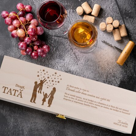 Notă: Vinul nu se poate alege. În funcție de stocul disponibil se trimite Budureasca sau Domeniile AvereștiSee also other Gifts for the family, Personalised engraved boxes for him, Wooden gifts, Personalised wine boxes for one bottle, Engraved gifts, Personalised gifts, Personalised wooden wine boxes, Our recommendations, Gifts for wine enthusiasts, Personalised gifts for adults, Personalised gifts for dad, Engraved gifts for dad, All wine boxes, Engraved wine boxes, Engraved wine boxes for the family, Appreciation gifts, Gifts for parents, Engraved wooden boxes.