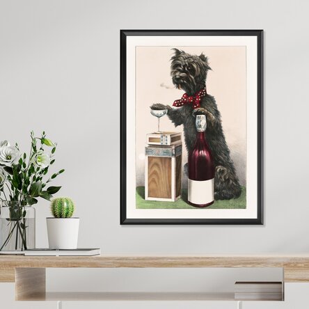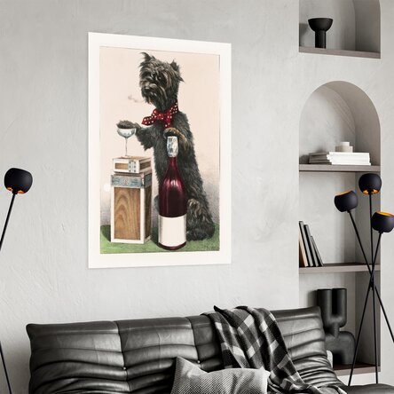 Un poster cu un umor fin și o notă vintage decadentă. Imaginea prezintă un cățel cu aer sofisticat, purtând un papion roșu cu buline și savurând o băutură într-un pahar elegant, cu o țigară aprinsă între buze. Stă lângă o sticlă de vin și o cutie de trabucuri, într-un decor ce amintește de cabaretele pariziene sau de petrecerile absurde din anii ’20.