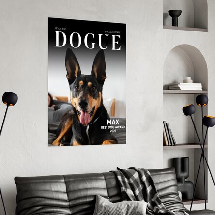 Transformă-ți cățelul într-o adevărată vedetă de copertă cu acest poster personalizat inspirat de o celebră revistă de modă – doar că, de data aceasta, starul nu este un model obișnuit, ci prietenul tău necuvântător! Cu un design elegant și amuzant, acest poster parodiază coperta unei reviste de lux, dar în centrul atenției este adorabilul tău companion canin.