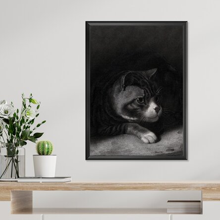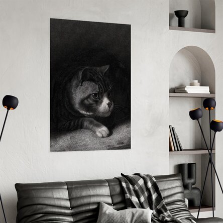 Ascunsă în penumbra liniștită, silueta pisicii pare o prezență vie, gata să reacționeze la orice mișcare din jur. Privirea intensă, plină de curiozitate și control, adaugă o tensiune subtilă scenei, evocând lumea secretă și enigmatică a acestor creaturi grațioase.