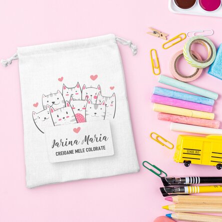 Iubitoare de pisicuțe? Personalizează cu un text simpatic si nume și poți avea cel mai vesel și simpatic săculeț cu pisicuțe curioase să vadă cu ce te ocupi la activitățile recreative.