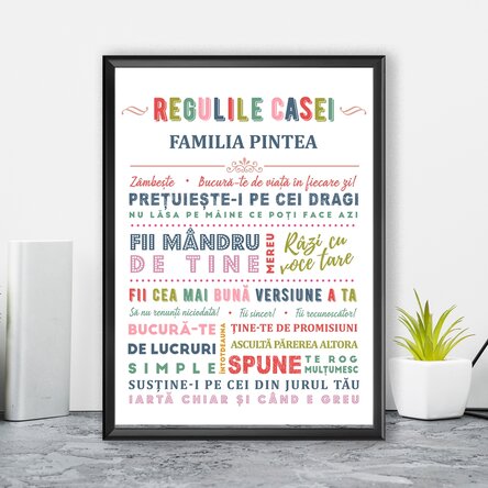Pentru ca totul să fie în ordine, membrii familiei trebuie să respecte câteva reguli, cum ar fi: să se îmbrățișeze cât mai des, să zâmbească în fiecare zi și să petreacă timp împreună. Acest tablou cuprinde principalele reguli, iar tu îl poți personaliza cu numele familiei tale. Își va găsi locul pe peretele din sufragerie și vă va aminti zilnic să fiți fericiți.