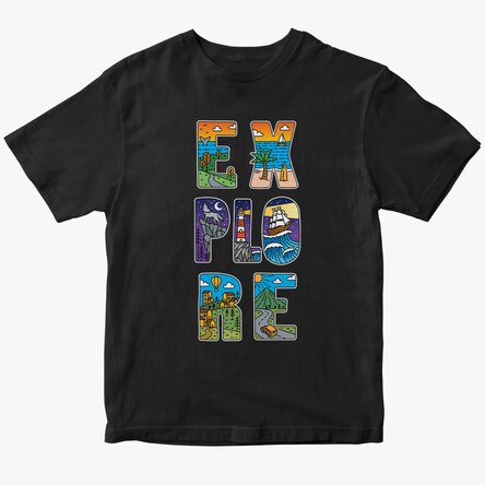Lasă-i pe cei mici să descopere lumea cu un tricou plin de aventură! Cuvântul "Explore" este ilustrat creativ, fiecare literă având în interior un peisaj diferit – munți, mare, păduri verzi și cer senin – care transformă acest tricou într-o invitație la vacanță și distracție. Este perfect pentru joacă, excursii sau zilele călduroase de vară.